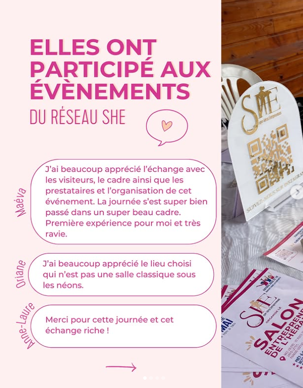 Ta présence est relayée sur les réseaux sociaux des réseaux partenaires et dans la newsletter SHE.